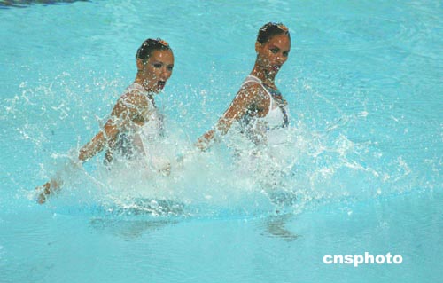 當(dāng)?shù)貢r間8月24日晚,埃及隊在雅典奧運會進(jìn)行雙人花樣游泳比賽。中新社記者:王瑤