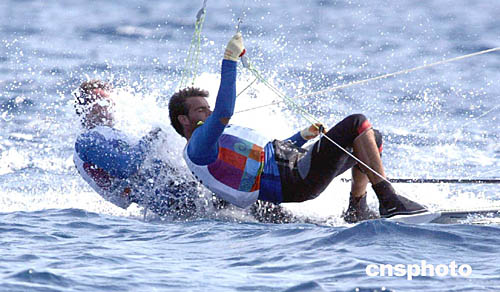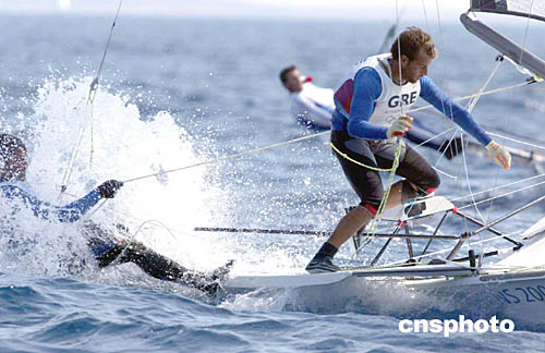 圖為在當(dāng)?shù)貢r(shí)間8月24日進(jìn)行的帆船帆板比賽中,PACHOUMAS Athanasios和PORTOSALTE Vasileios的精彩表現(xiàn)。