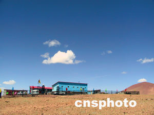 從格爾木出發(fā),沿青藏公路驅(qū)車在三百二十公里,在青藏公路和鐵路線之間的山崗上,藍天白云下一幢紅頂藍墻的塑鋼建筑格外醒目。它就是青藏鐵路北麓河試驗段的大本營——中科院凍土工程國家重點實驗室青藏高原研究基地。