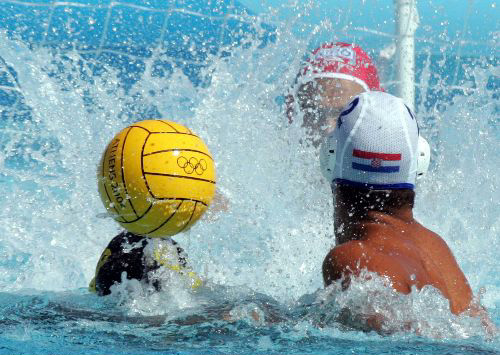 當(dāng)?shù)貢r(shí)間8月25日上午,雅典奧運(yùn)會男子水球比賽進(jìn)入白熱化階段,非洲冠軍埃及隊(duì)(黑帽)雖然竭盡全力防守和進(jìn)攻,但是由于實(shí)力差距較大而以1比12的懸殊比分負(fù)于克羅地亞隊(duì)。比賽中,一名埃及隊(duì)員在對方門前頭頂運(yùn)球進(jìn)攻。作者:任晨鳴
