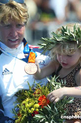 圖為美國選手威廉姆斯獲得女子鐵人三項銅牌后擁抱著女兒展示獎牌的場景。