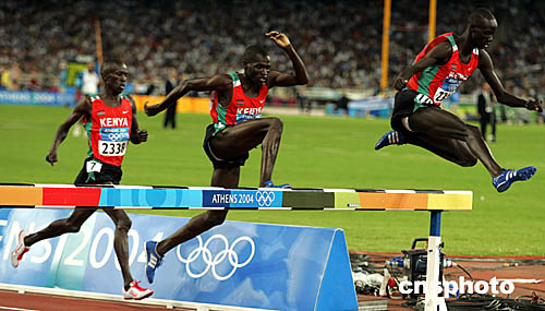 圖為在男子3000米障礙賽中,肯尼亞選手Brimin Kipruto和他的同胞Ezekiel Kemboi和Paul Kipsiele Koech的出色表現(xiàn)。