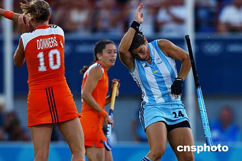 圖為在當(dāng)?shù)貢r(shí)間8月24日舉行的女子曲棍球荷蘭隊(duì)與阿根廷的比賽現(xiàn)場(chǎng)畫(huà)面。最后荷蘭隊(duì)以3比2戰(zhàn)勝阿根廷隊(duì)取得勝利。