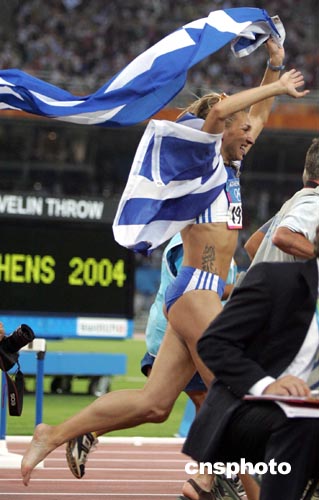 當(dāng)?shù)貢r間八月二十五日晚,在雅典奧運(yùn)會田徑女子四百米欄決賽中,希臘選手郝克亞以五十二秒八二的成績獲得冠軍。中新社記者:毛建軍
