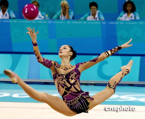 雅典當(dāng)?shù)貢r(shí)間八月二十五日,俄羅斯藝術(shù)體操個(gè)人全能選手KABAEVA進(jìn)行奧運(yùn)會(huì)賽前排練。中新社記者:王瑤