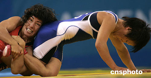 圖為在美國選手Patricia Miranda和俄羅斯選手battles Lorisa Oorzhak在女子48公斤級(jí)摔交比賽中的鏡頭。