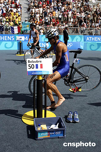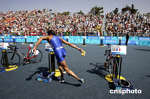 圖為在當(dāng)?shù)貢r(shí)間8月26日舉行的男子三項(xiàng)全能比賽中的一幕。