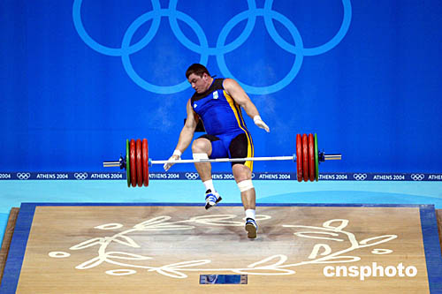 圖為烏克蘭選手Oleksiy Kolokolstev在男子105公斤級(jí)舉重比賽中試舉失敗的鏡頭。