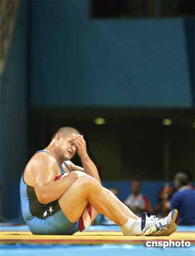 圖為美國選手Rulon Gardner抱著美國國旗坐在比賽場地上,他將在此結(jié)束自己的摔交生涯。當把鞋脫下留在毯子上時,他再也難掩內(nèi)心的傷感。