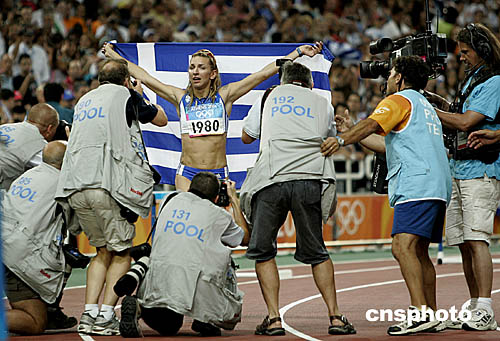 圖為希臘選手哈爾吉娜(Fani Halkia)在獲得女子400米欄賽的冠軍后成為各大媒體的追逐者。