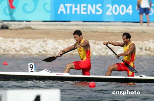 當?shù)貢r間八月二十七日,在雅典奧運會男子雙人劃艇一千米比賽中,中國選手孟關良、楊文軍獲得第九名。中新社記者:毛建軍