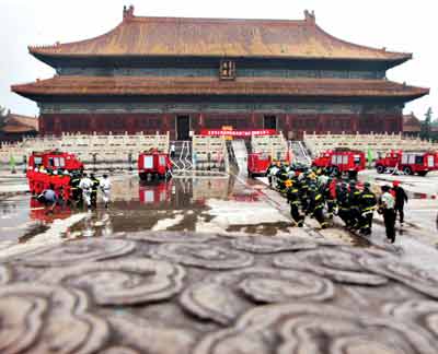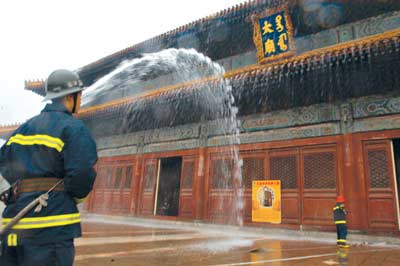 故宮消防中隊出動兩名搶險員,搶救被燒物資,同時府右街消防中隊派出兩副擔架,從殿內“火海”中救出兩名“傷員”。花市消防中隊的數名消防員,在殿內架起兩節(jié)梯,從內部滅火。