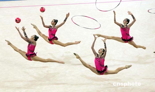 雅典時間8月28日,2004年奧運(yùn)會藝術(shù)體操決賽在雅典舉行,俄羅斯隊(duì)以51.100分的最高分奪得冠軍。中新社記者:王瑤