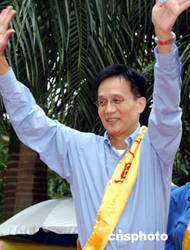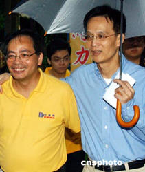 八月二十九日,香港民建聯(lián)舉行2004立法會(huì)選舉誓師大會(huì),剛剛手術(shù)出院的民建聯(lián)主席馬力與港島區(qū)候選人一起在誓師大會(huì)上,為進(jìn)軍2004立法會(huì)選舉造勢(shì)。作者:錢興強(qiáng)