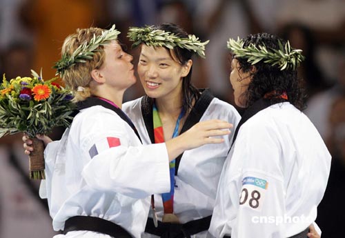 當(dāng)?shù)貢r(shí)間八月二十九日,中國(guó)選手陳中在雅典奧運(yùn)女子六十七公斤以上級(jí)跆拳道決賽中戰(zhàn)勝法國(guó)選手獲得冠軍。中新社記者:毛建軍