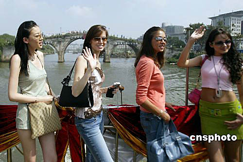 8月30日,參加2004年新絲路世界模特大賽的二十九個國家和地區(qū)的四十多名選手齊聚浙江省杭州市,開始她們的時尚杭州之旅,大賽組委會組織參賽佳麗們游覽西湖、乘船沿運(yùn)河觀光,逛杭州著名的河仿街和絲綢城,夜晚竹海漂流,使模特們進(jìn)一步貼近杭州,貼近市民生活。大賽決賽將與9月5日在杭州舉行。中新社記者 盛佳鵬 攝