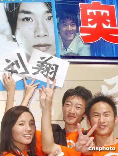 圖為奧運(yùn)110米欄冠軍、中國(guó)飛人劉翔與前來(lái)歡迎的體育迷合影留念。中新社記者:武仲林