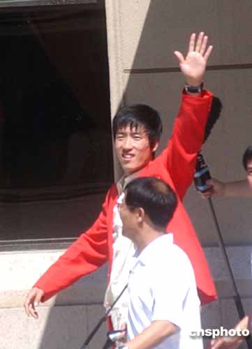 中國(guó)飛人、奧運(yùn)110米欄冠軍劉翔向在北京首都國(guó)際機(jī)場(chǎng)歡迎的民眾揮手致意。中新社記者:武仲林
