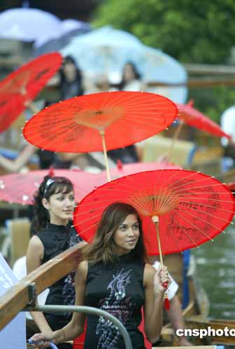 8月31日,參加“時(shí)尚杭州之旅”2004年新絲路世界模特大賽的29個(gè)國(guó)家和地區(qū)的40多名參賽佳麗在浙江省杭州乘木船、撐油紙傘泛舟西湖。世界模特大賽決賽將與9月5日在杭州舉行。中新社記者:盛佳鵬