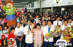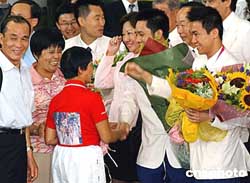 代表團(tuán)今天中午返抵機(jī)場,雅典奧運(yùn)贏得乒乓球男雙銀牌的高禮澤及李靜亦隨隊(duì)抵港,三百多名熱愛乒乓球的小朋友,獲安排到機(jī)場迎接,高禮澤及李靜的父母,以及民政事務(wù)局長何志平、康文署長王倩儀等官員,亦到機(jī)場迎接。