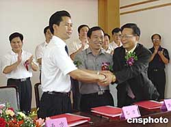 中國—東盟經(jīng)濟(jì)園管委會(huì)主任韋志鵬(前左一)與一新入駐企業(yè)代表簽約。該區(qū)于二○○三年十二月建立,入駐企業(yè)逐漸增多。作者:楊志雄