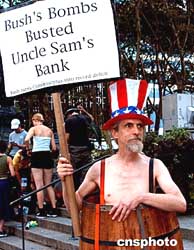 美國公民紐約街頭指責布什。一位抗議者把一只木桶套身上,舉著“布什的炸彈摧毀了山姆大叔的銀行”的抗議標語,批判布什政府發(fā)動的反恐戰(zhàn)爭。當日,共和黨大會正在紐約舉行,曼哈頓街頭隨處可見反對布什的標語。作者:趙海燕