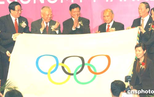 第八屆北京香港經(jīng)濟(jì)合作研討洽談會暨奧運(yùn)經(jīng)濟(jì)市場推介會9月2日在香港會展中心開幕﹐北京市市委書記劉淇與市長王歧山﹑全國政協(xié)副主席霍英東﹑香港特首董建華﹑香港中聯(lián)辦主任高祀仁共同打開2008年在北京舉辦的第29屆奧林匹克運(yùn)動會會旗。作者:趙振清