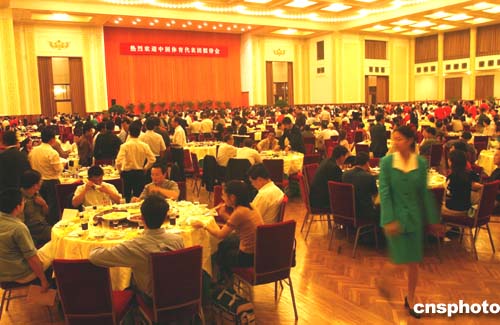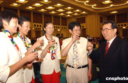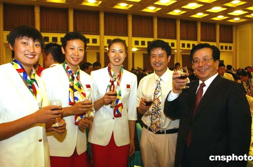 九月二日晚,中共中央辦公廳、國(guó)務(wù)院辦公廳在北京人民大會(huì)堂宴會(huì)廳舉行招待會(huì),歡迎載譽(yù)歸來(lái)的第28屆奧運(yùn)會(huì)中國(guó)體育代表團(tuán)。中共中央政治局常委、國(guó)家副主席曾慶紅向獲得奧運(yùn)冠軍的中國(guó)女排祝酒。中新社記者:武仲林