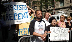美東時間九月二日,美國總統(tǒng)布什來到紐約曼哈頓,準(zhǔn)備出席在這里舉行的共和黨全國代表大會閉幕式。當(dāng)總統(tǒng)車隊經(jīng)過被全線封鎖的市中心街道時,路邊一位婦人打著“支持布什”的標(biāo)語。但他身邊的男子展開更寬大的橫幅,上書“法西斯分子該悔悟了”。作者:龔文謨