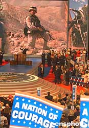在美國共和黨大會閉幕式上,伊拉克戰(zhàn)場總指揮弗蘭克斯發(fā)表演講,為布什發(fā)動(dòng)的反恐戰(zhàn)爭辯護(hù),突出反恐主題。作者:趙海燕