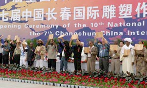 第七屆雕塑展邀請了二十三個國家的雕塑家現(xiàn)場創(chuàng)作了二十六件作品,其中有十個國家尚未與中國建交。圖為部分雕塑家獲長春市政府頒發(fā)的“長春杯”榮譽證書。