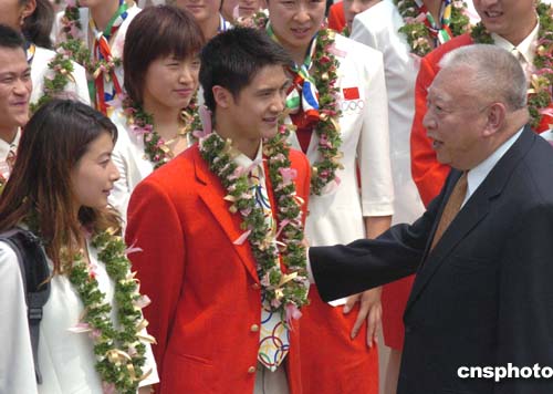 由袁偉民任團(tuán)長(zhǎng)的中國(guó)奧運(yùn)金牌代表團(tuán)一行共有68人,包括了在雅典榮獲32枚金牌的全部運(yùn)動(dòng)員和許海峰、陳忠和等7位著名教練。