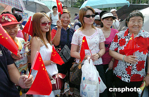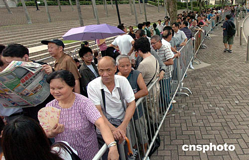 由五十位中國奧運金牌選手和香港當(dāng)紅藝人聯(lián)袂奉獻(xiàn)的大匯演定于晚間七點正式開始,但不到下午三點,匯演地點大球場外已經(jīng)有超過二百名香港市民冒酷暑、頂烈日在排隊“霸位”。他們個個“裝備齊全”,帶了水、遮陽傘和面包點心,說起來看奧運健兒表演,都有掩飾不住的喜悅與興奮之情。