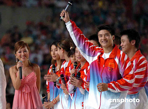 “奧運金牌精英大匯演”7日晚上在香港政府大球場舉行,全場爆滿。圖為“跳水王子”田亮向在場舉手致意。作者:洪少葵