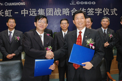 中新四川網(wǎng)9月8日消息(肖青)四川長虹集團公司董事長趙勇與中國遠(yuǎn)洋運輸(集團)總公司總裁魏家福今日在綿陽分別代表長虹集團和中遠(yuǎn)集團簽署了戰(zhàn)略合作協(xié)議書,雙方承諾將在國際運輸、物流、服務(wù)、信息方面展開更深更廣的合作,此舉標(biāo)志著兩公司已經(jīng)超越業(yè)務(wù)合作進(jìn)入一個嶄新的階段。