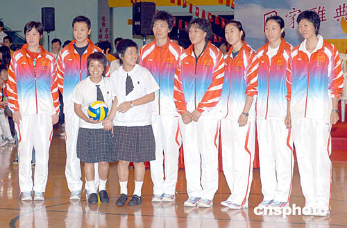 國家奧運(yùn)金牌代表團(tuán)9月8日在香港與中學(xué)生運(yùn)動(dòng)交流,并舉行抽獎(jiǎng)活動(dòng),中國女排部份隊(duì)員向獲獎(jiǎng)學(xué)生致送簽名排球及合照。作者:鄧慶樂