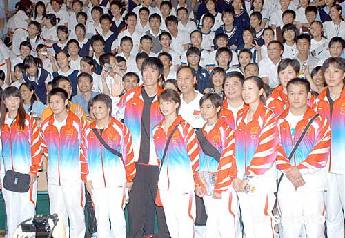 國家奧運金牌代表團9月8日在香港與中學(xué)生運動交流,并與會場上的中學(xué)生合照。作者:鄧慶樂