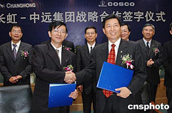 九月八日,長(zhǎng)虹集團(tuán)和中遠(yuǎn)集團(tuán)在四川綿陽(yáng)簽署戰(zhàn)略合作協(xié)議書,雙方將在國(guó)際運(yùn)輸、物流、服務(wù)、信息方面展開(kāi)更深更廣的合作。圖為長(zhǎng)虹董事長(zhǎng)趙勇(左)與中遠(yuǎn)集團(tuán)總裁魏家福(右)簽定戰(zhàn)略協(xié)議。作者:陳紅