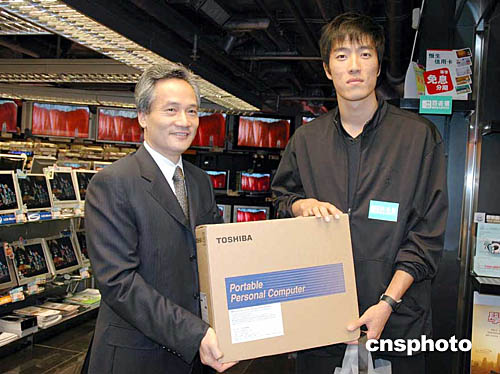 國家奧運選手在香港展開訪港行程,9月8日,部分金牌選手到尖沙咀海港城海洋中心選購總值十多萬元電器產(chǎn)品。圖為劉翔與百老匯代表合影。作者:洪少葵