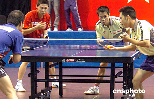 為歡迎國家奧運金牌代表團(tuán)訪港,九月八日香港舉行“中國人的驕傲--奧運金牌精英顯風(fēng)采”奧運金牌羽毛球及乒乓球表演。圖為奧運乒乓球男子雙打金牌得主馬林、陳杞與銀牌得主香港的李靜、高禮澤進(jìn)行混合友誼賽。中新社記者:錢興強(qiáng)