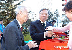 | 中國(guó)科學(xué)院研究生院九月九日在北京玉泉路教學(xué)園區(qū)隆重舉行了二零零四級(jí)研究生開(kāi)學(xué)典禮。典禮上中科院研究生院物理科學(xué)學(xué)院、化學(xué)與化學(xué)工程學(xué)院、資源與環(huán)境學(xué)院正式成立。全國(guó)人大副委員長(zhǎng)、中國(guó)科學(xué)院院長(zhǎng)路甬祥院士(右)為物理科學(xué)學(xué)院院長(zhǎng)、原國(guó)家自然科學(xué)基金委員會(huì)主任陳佳洱院士頒發(fā)聘書(shū)。作者:徐曦弋