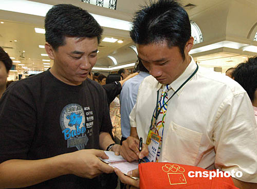中國雅典奧運金牌選手代表團九日抵達澳門訪問,當(dāng)天下午部分選手到商埸輕松購物,金牌選手孟關(guān)良在商埸熱情?澳門市民簽名。作者:梁永強