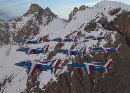 法國空軍的“法蘭西巡邏兵”飛行表演隊(duì)正式成立于1964年2月。飛行表演隊(duì)的飛機(jī)涂著同法國國旗一樣的紅、白、藍(lán)三種顏色,機(jī)群在空中做飛行表演時(shí)也常常把著三種顏色的煙跡留在空中。它象征著“自由”(紅色)、“民主”(白色)、“博愛”(藍(lán)色),體現(xiàn)了法國人民勇敢、浪漫的傳統(tǒng)和對未來美好的愿望。圖為8機(jī)正方形編隊(duì)(來源:艦船知識網(wǎng)絡(luò)版)