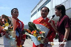 率弟子石智勇、吳美錦在第二十八屆雅典奧運會上分別奪得男子舉重六十二公斤級金牌、五十六公斤級銀牌的著名舉重教練陳文斌(圖中),九月十三日載譽(yù)回到家鄉(xiāng)福建,成為當(dāng)?shù)孛襟w記者爭先采訪的主角。作者:劉可耕
