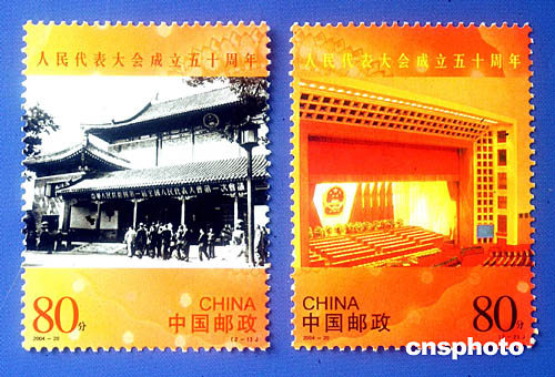 為紀念全國人民代表大會成立五十周年,國家郵政局定于9月15日發(fā)行《人民代表大會成立五十周年》紀念郵票1套2枚,兩枚郵票的名稱分別為:一屆全國人大一次會議在中南海懷仁堂舉行、莊嚴的人民大會堂主席臺,兩枚郵票的面值均為80分。中華人民共和國第一屆全國人民代表大會第一次會議于1954年9月15日在北京召開。中新社記者:鄒憲