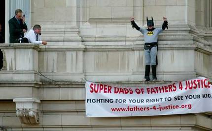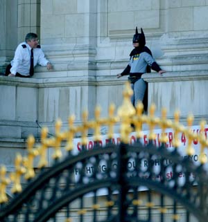 這名抗議者詹森·哈奇,今年32歲,是英國維護(hù)父權(quán)組織“為父親討公道(Fathers 4 Justice)”的一名成員,他扮成蝙蝠俠模樣,闖入女王伊麗莎白二世居住的白金漢宮,爬上宮殿正面一個陽臺,又從陽臺走到危險(xiǎn)的墻檐上,引來大群圍觀者。大為尷尬的白金漢宮安全官員當(dāng)天晚上即對此事展開調(diào)查。