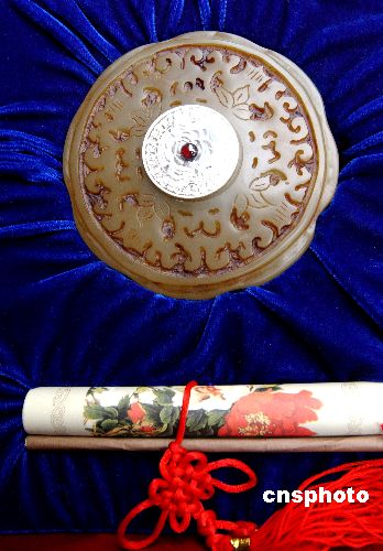 2004年9月14日,鄭州,一位銷售人員在展示一款由純天然巴林玉石璧和純銀組成的月餅,月餅天然寶石。這款月餅?zāi)壳笆蹆r(jià)8000元左右。馬健 攝