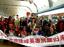 西藏自治區(qū)體育局、中國科學(xué)探險協(xié)會主辦的“珠穆朗瑪峰環(huán)保大行動”圓滿結(jié)束,十六日二十余名志愿者、新聞記者順利返回北京時,興高采烈地在首都機(jī)場合營留念,祝賀活動圓滿結(jié)束。中新社記者:宋吉河