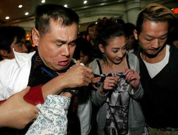 聽說張美人終于要下樓了,門口一片沸騰,當張柏芝在幾位隨從人員的簇擁下出場時,現(xiàn)場炸開了鍋,尖叫聲一浪高過一浪。大家的雙臂熱情地伸向張柏芝,快到門口時,張柏芝身邊一位助手更是把她緊緊摟在懷里,剛到門口,立刻伸過來3只手向張柏芝胸口“進軍”,大美女被嚇得花容失色,一位伸手企圖和張柏芝親密接觸的男子更是笑得比花還燦爛。