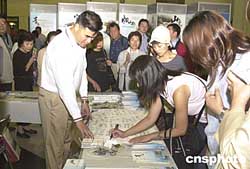 九月十九日在東京鐵路客站大廳舉行的“二零零八相約奧運(yùn)揚(yáng)帆青島”推介展示活動,吸引了眾多日本民眾。他們在展臺前排起長隊(duì)索取資料,并在一塊象征奧運(yùn)帆船賽揚(yáng)帆青島的白色帆布上簽名,表示關(guān)注和支持。作者:王健
